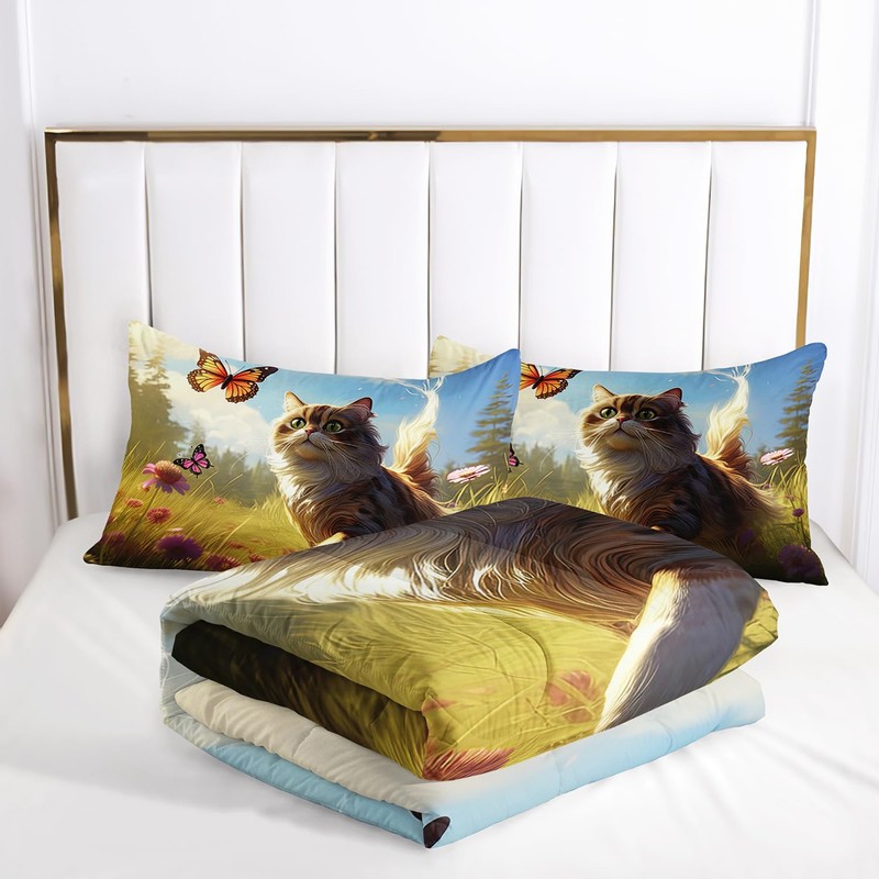 Nttopship Cute Cat Comforter Set for Kids and Adults, Spring Cat Theme Twin Size Bedding Set for All Season with 3 Pcs: 1 Comforter and 2 Pillow Cases