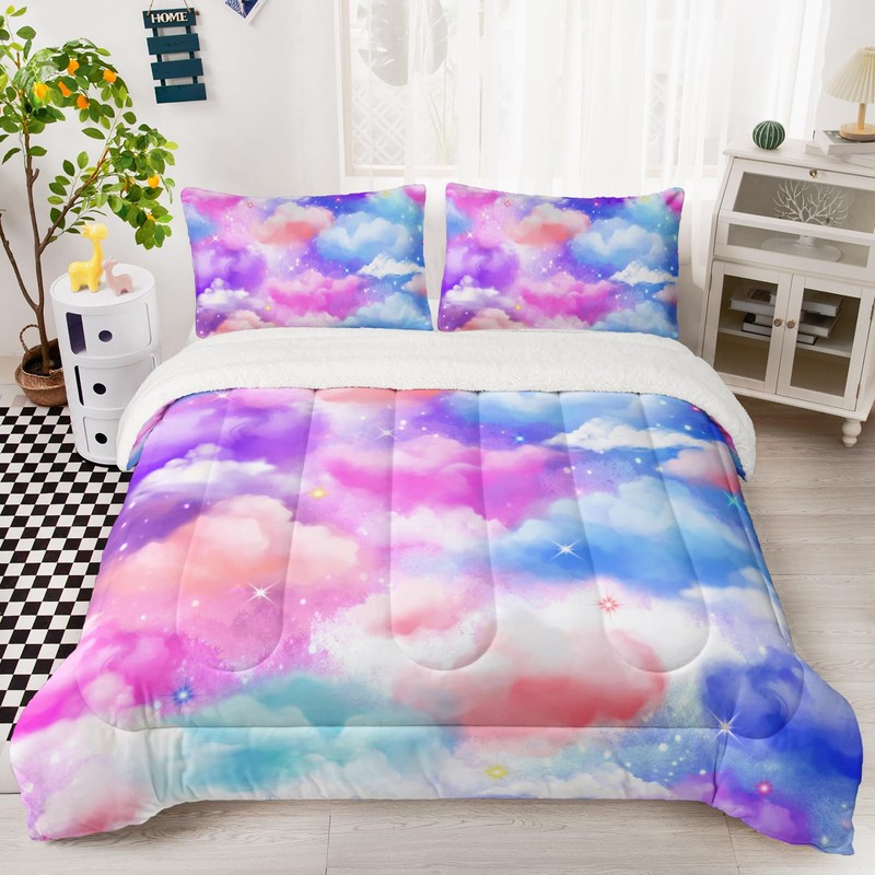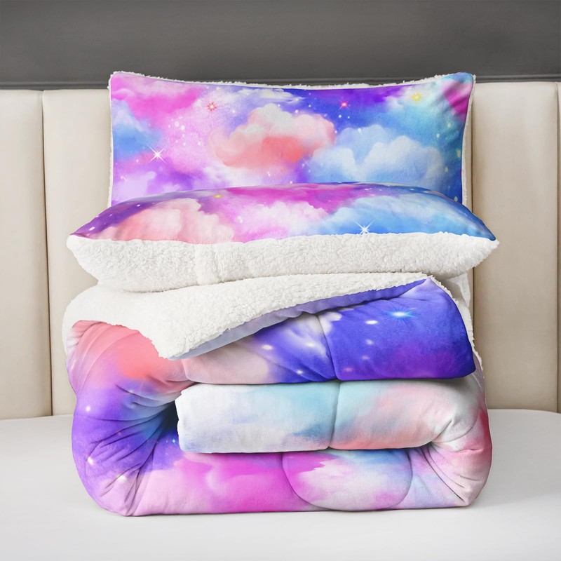 Nttopship Pink Clouds Comforter Set Queen Size for Boys Girls Pink Blue Cloud Sky 3D Digital Printing,Sherpa Fleece-Backing Premium,Winter Lightweight Soft Microfiber Bedding with 2 Pillow Shams