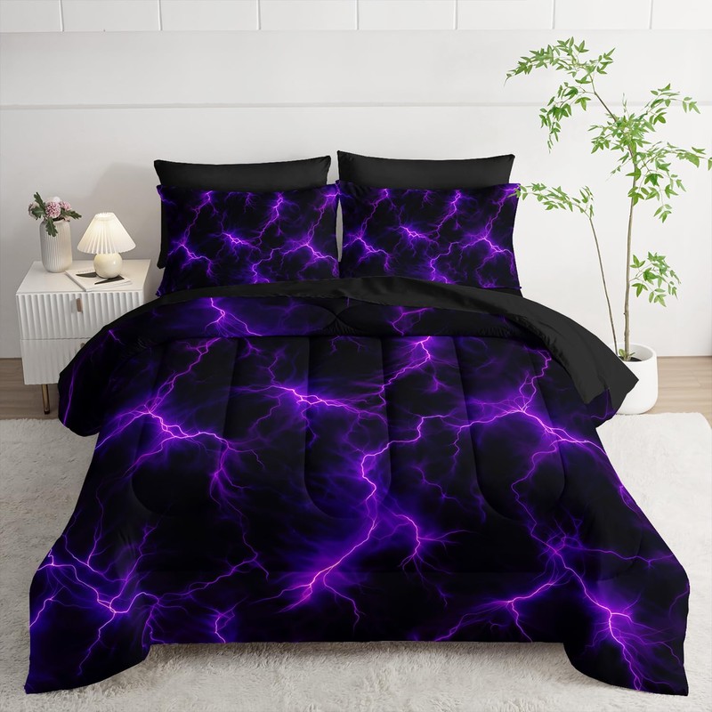 - Full 7 Piece Purple Lightning Bedding Set Included : 1 Purple Lightning comforter 80 inch x 90 inch + 2 Purple Lightning pillowcases 20 inch x 30 inch - 1 black fitted sheet 54 inch x 75 inch - 1 black flat sheet 80 inch x 96 inch -2 black pillowcase 20 inch x 30 inch.