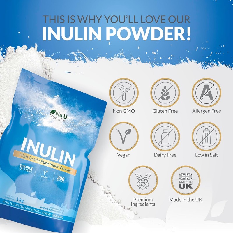 Nu U Nutrition Inulin Prebiotic Powder (1kg) – High-Fibre Fructo-Oligosaccharides (FOS) from Chicory Root, 200 Servings, Vegan & Gluten-Free, Natural Digestive Support