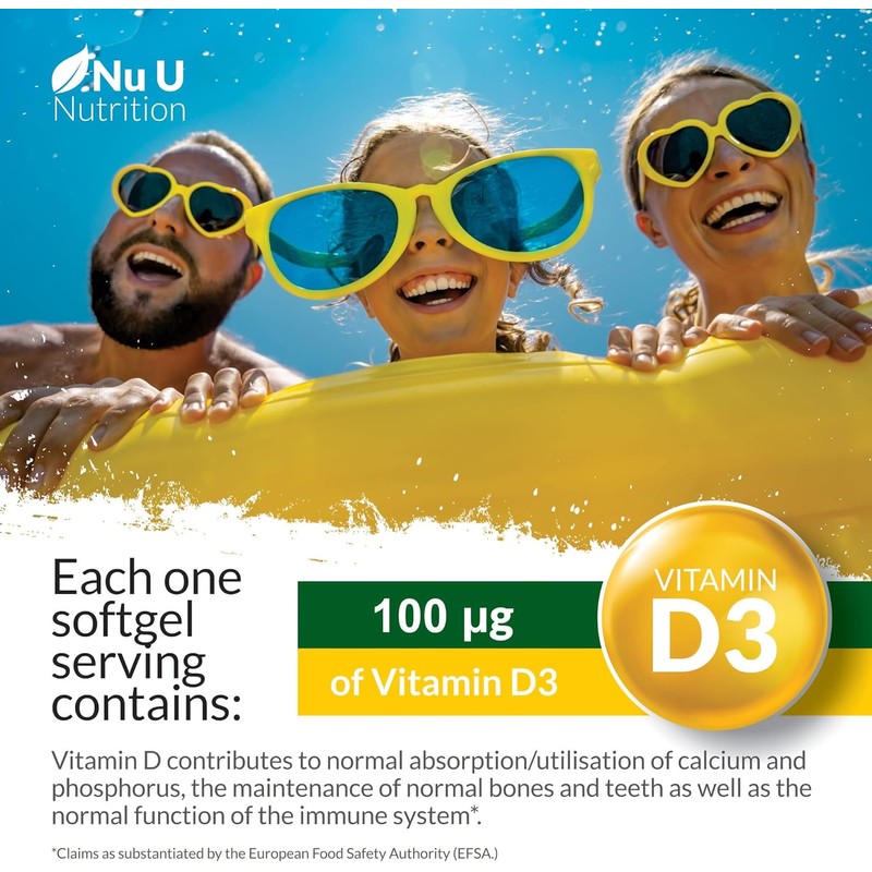 Boost your health with NU U Nutrition Vitamin D3 4000 IU, a high-strength supplement designed to support strong bones, teeth, muscle function, and a healthy immune system. With a full 1-year supply of 365 softgel capsules, this supplement ensures convenience and consistency, eliminating the need for frequent reordering.