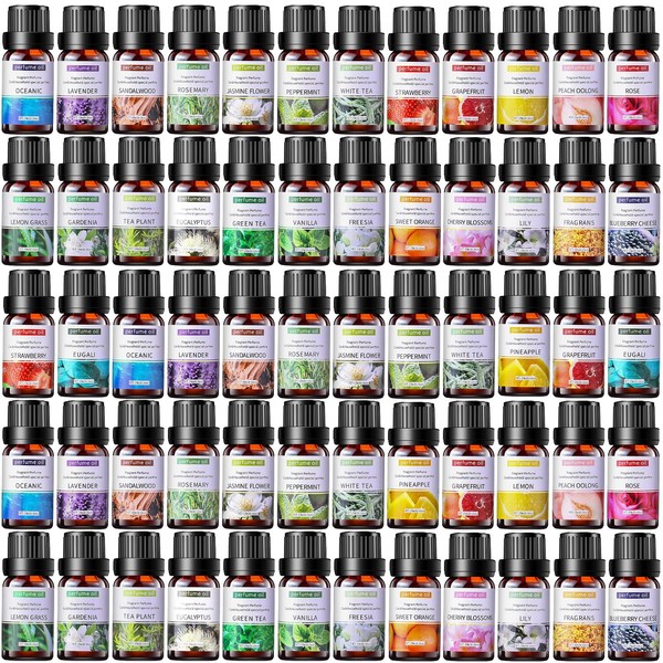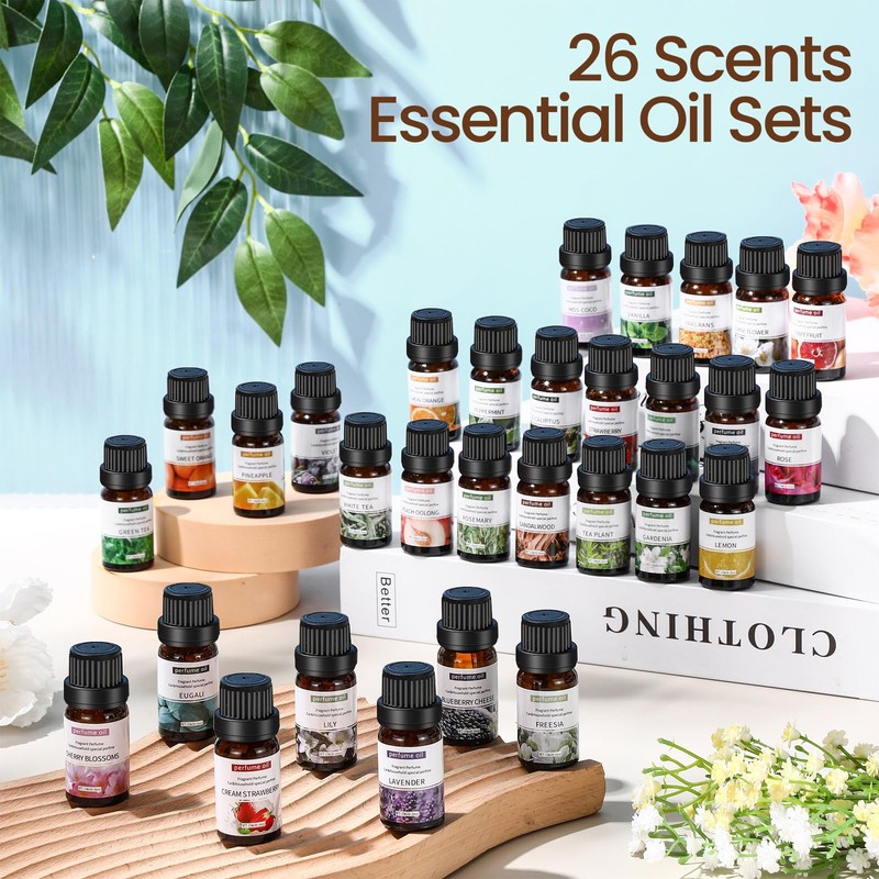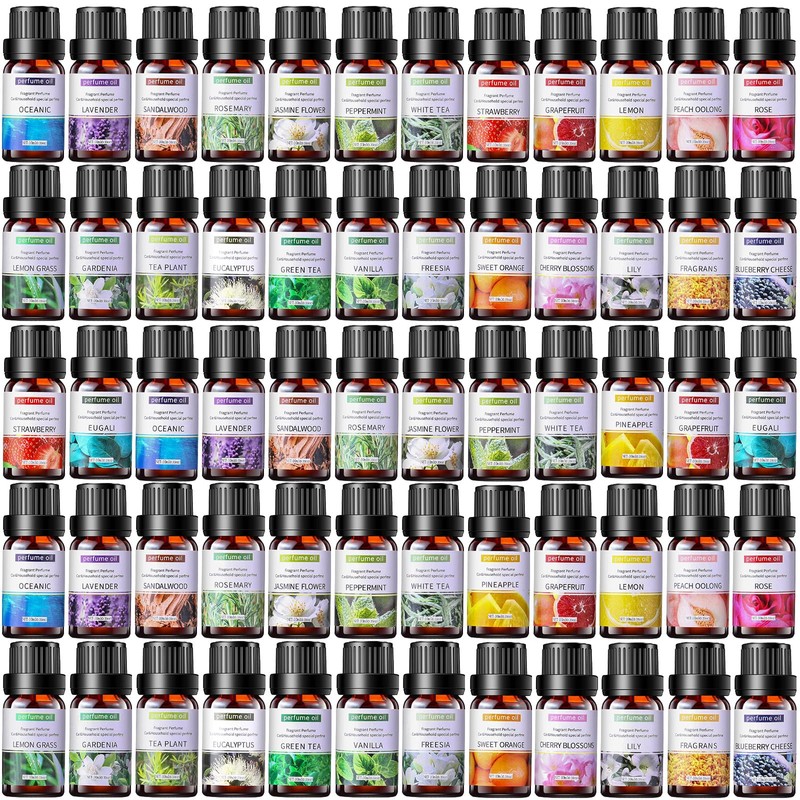 • Essential Oil Set: you will receive 52 bottles of essential oils, 10 ml each, with 26 scents including lemon, violet, grapefruit, sandalwood, sweet orange, vanilla, white peach, freesia, lavender, gardenia, cherry blossom, blueberry cheese, green tea, rose, rosemary, eucalyptus, ocean, lemongrass, osmanthus, tea tree, jasmine, pineapple, strawberry, eucalyptus and peppermint