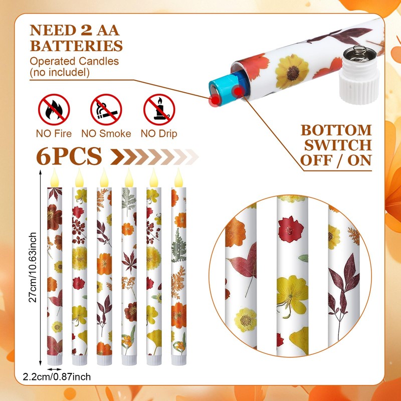 - Fall Taper Candles Sets: you'll receive 6 flameless taper candles with maple leaf and dried-floral designs; Instantly bring cozy autumn vibes to your home; Each fall LED candle uses 2 AA batteries (not included); Remote control not included