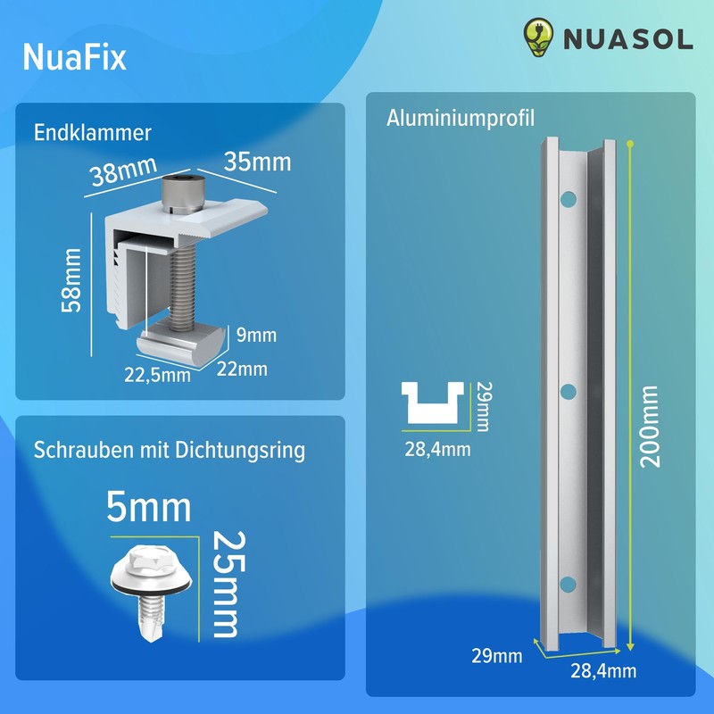 - Everything included: You will receive a mounting kit for mounting 2 solar panels on a trapezoidal sheet roof. Contents: 4 mounting rails (200 mm), 4 end clamps and 12 wood screws.