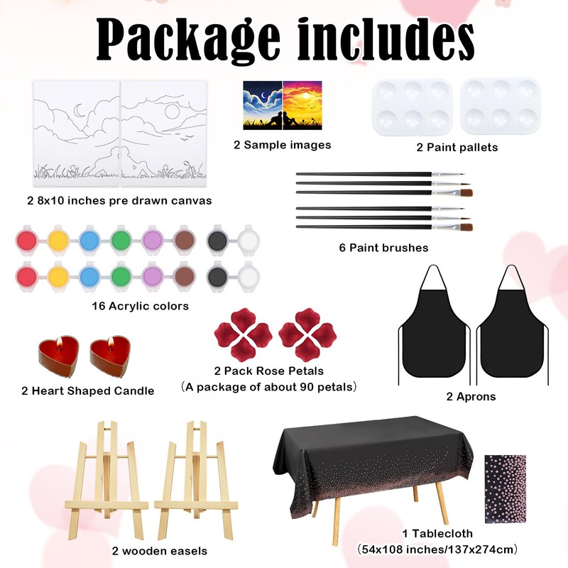 - Create a Romantic Atmosphere: Date night painting kit prepared 2 romantic heart-shaped candles, 2 packs of silk rose petals and tablecloth for you, these small items will help you create a warm and romantic environment, making your date night more memorable. The soft light of the candles and the elegant pattern of the tablecloth will add a special atmosphere to your creative space