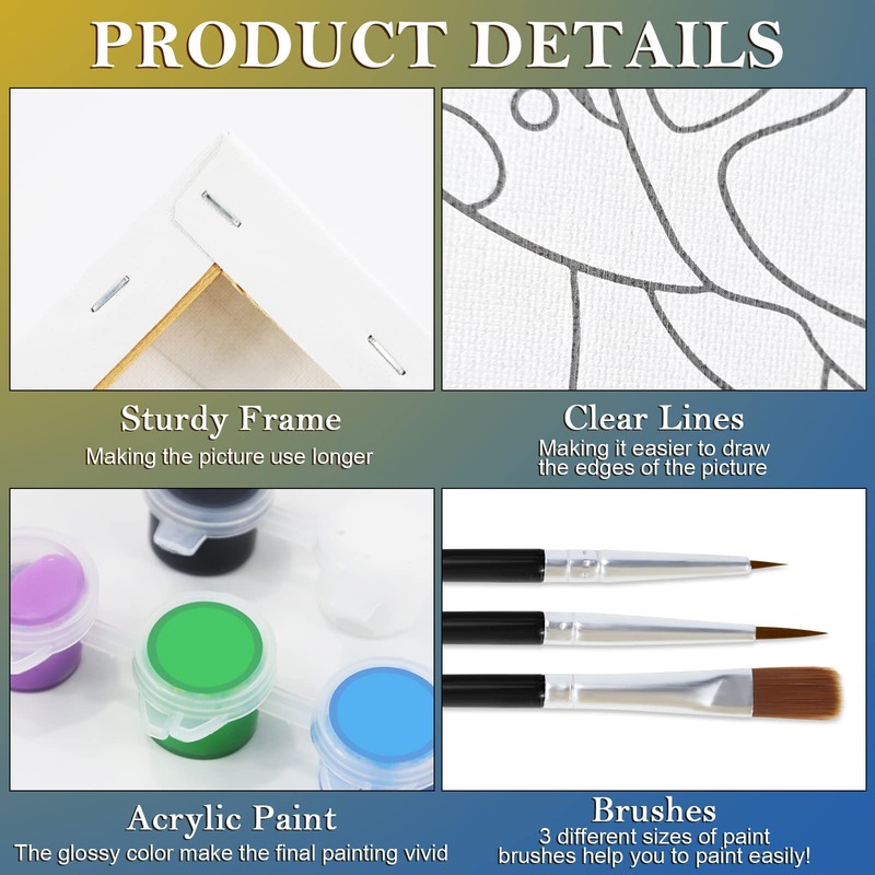 - 【Easy to Paint】No special skills are needed for this pre drawn canvas painting, we offer you high quality stretched canvas with clear print, the fabric is fine and easier to color. You can refer to the sample picture to paint or just use imagination to mix the 8 arcylic paints to paint what you want.