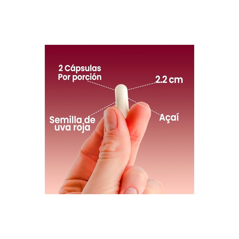 - ENVEJECIMIENTO: Reduce la apariencia de arrugas y líneas finas, manteniendo una piel joven y radiante gracias a los antioxidantes del resveratrol y la vitamina C. AUMENTA ENERGÍA Y VITALIDAD: Combate la fatiga y ayuda a mejorar la resistencia física y mental, proporcionando un impulso natural de energía para tu día a día. FÓRMULA ENRIQUECIDA CON ACAÍ Y PIMIENTA NEGRA: Potencia la absorción y eficacia del resveratrol con el poder antioxidante adicional del acaí y la pimienta negra, maximizando los beneficios para tu salud.