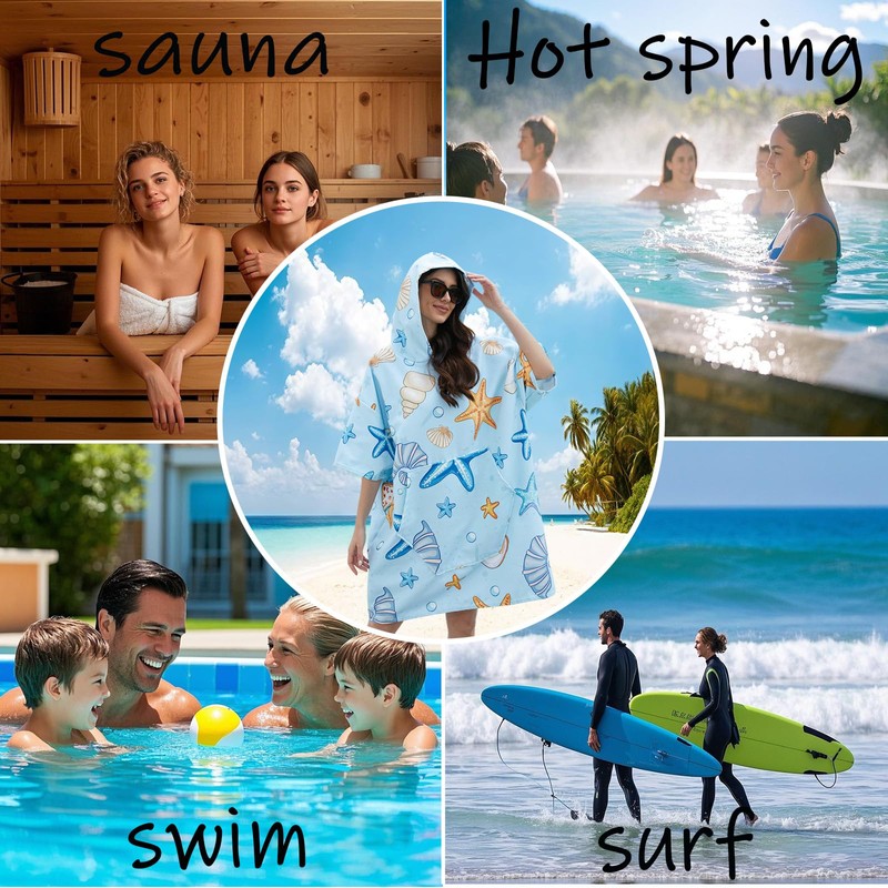 - Convenience: Surf Poncho After surfing, swimming, or outdoor activities, changing into a bathrobe or raincoat in a public place is your private changing room, where you can easily change into diving suits, swimsuits, or other clothing. The spacious and loose fit of the bath towel and swimming robe makes it easy for you to change into clothes