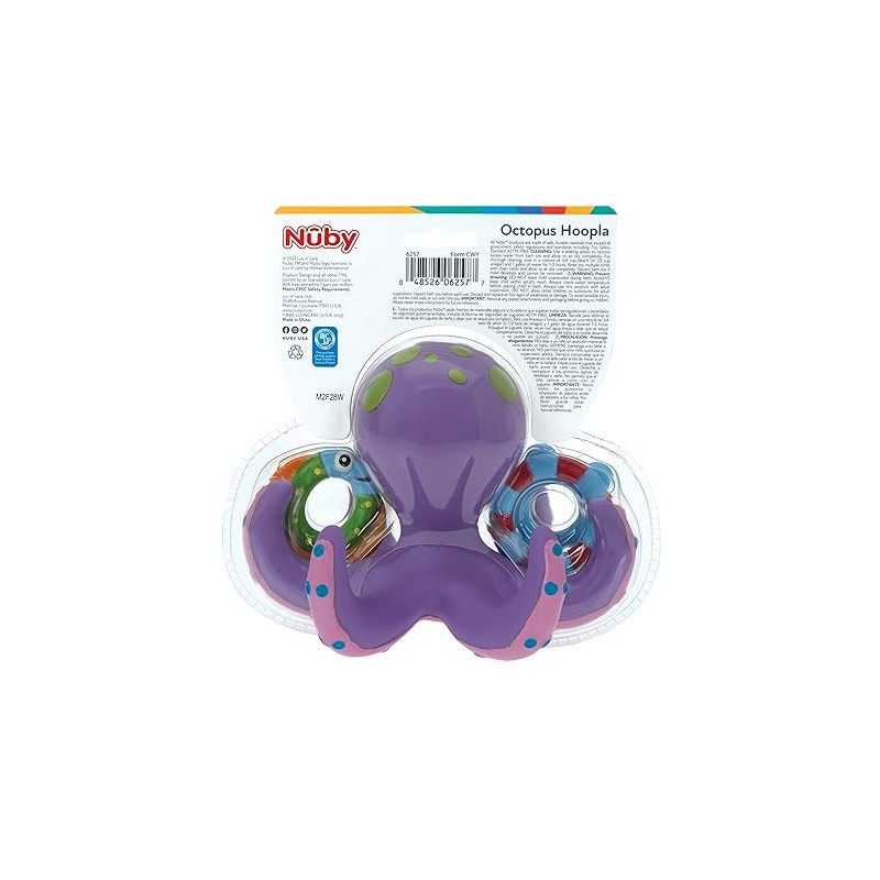 Make bath time an opportunity to grow and learn with Nuby's Floating Purple Octopus Bath Toy. Designed to engage your child's senses and challenge their motor skills, this cheerful octopus is on a mission for fun. Nuby's Octopus Hoopla toy floats in the bath water and includes three rings to toss and stack onto the Octopus' arms. This interactive element is intended to help develop hand-eye coordination. The fun colors and shapes stimulate your child's senses to make bath time exciting and enjoyable while the toy's different textures offer a tactile experience making it an easy bathing toy for little hands to grip. Getting clean has never been more fun with the Nuby Octopus Hoopla! Nuby baby bath toys are a safe and fun choice to teach your child fun.