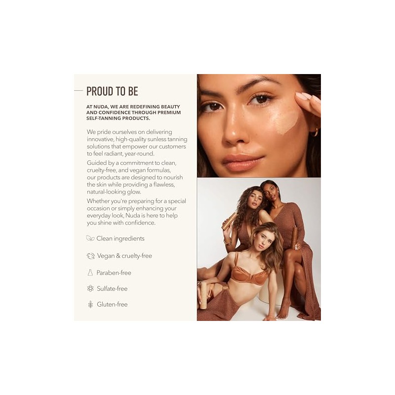 - WHO IS NUDA?: NUDA is a Canadian-based business founded in 2017 by Mahay and Genevieve, 2 passionate entrepreneurs who wanted to provide a safe alternative to sun exposure by offering sunless tanning and skincare products. They started by offering spray tan solutions and training for spray tan artists. 3 years later, they launched a self tanning and skincare line for home use.