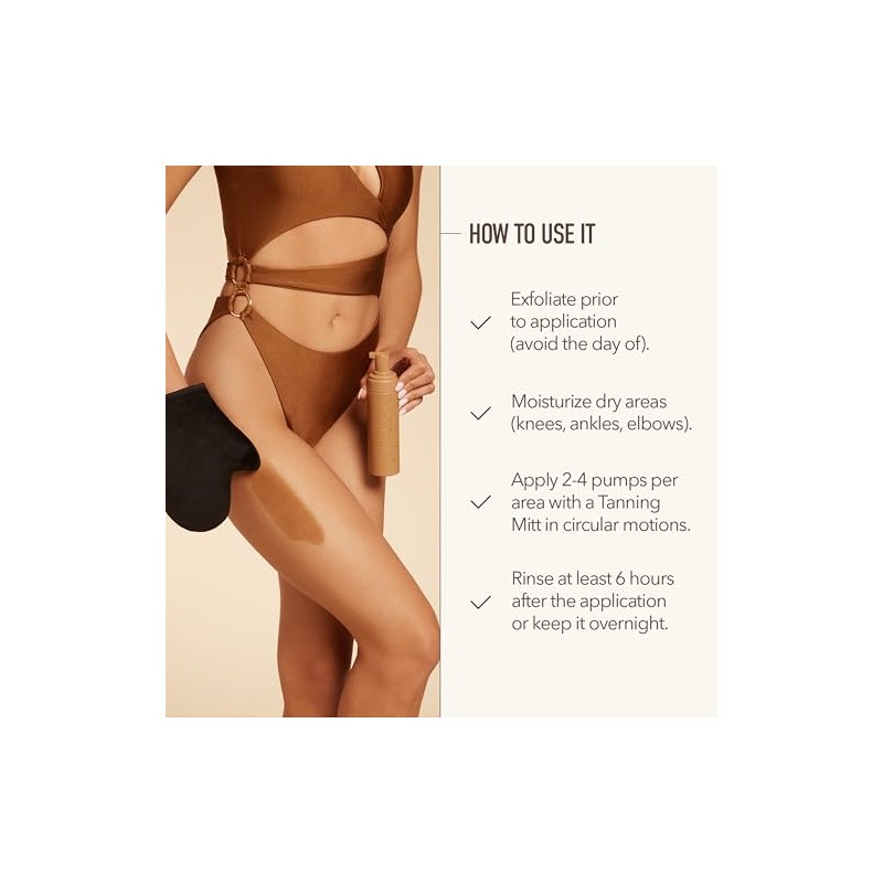 - EASY-TO-APPLY SELF TAN MOUSSE: Exfoliate days before applying. Don't exfoliate, wash, or shave on the day of application. Moisturize dry areas, including knees, ankles, feet, elbows, and knuckles. Dispense 2-4 pumps of mousse self tanner onto our tanning mitt. Apply onto dry, clean, and bare skin in a circular motion until evenly blended. Wait 6 hours before showering with warm water.