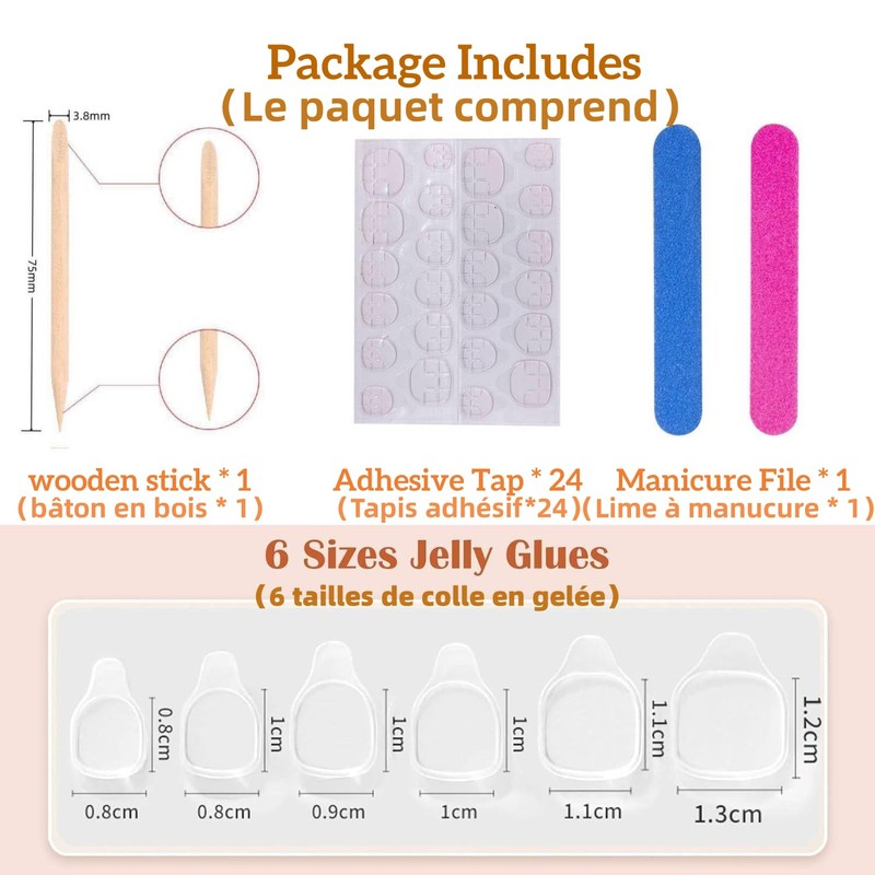 - 【High Quality Press on Nail Kkit】- You will get 24 pcs fake nails, 1pcs mini nail file, 1 pcs wooden stick and 24pcs nail double-side stickers, the french fake nails are divided into 12 different sizes, it is convenient for you to choose the fake nails that suit your nail.