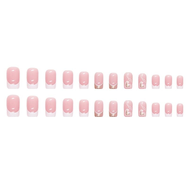 Nude Glitter White Heart Press on Nails Fake Nails Medium Short Coffin Square,Aqinmony with Designs False Nails Short Square, French Tip Full Cover Glue on Nails, Glossy Acrylic Thick Stick on Nails For Women 24Pcs CW41