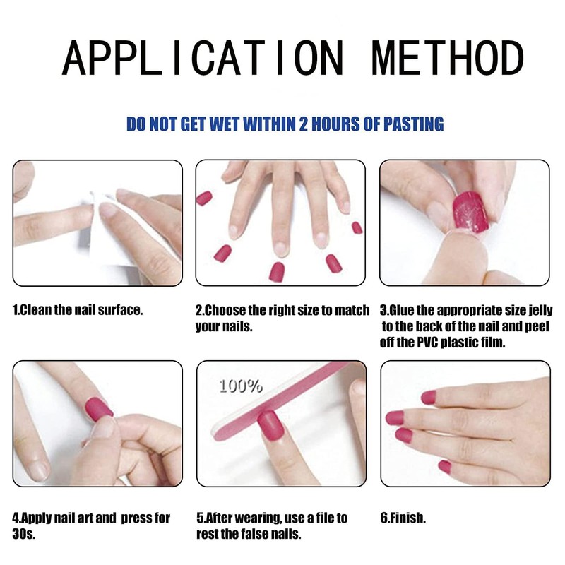 1.Start by gently filing and shaping your natural nails with the included nail file to create a smooth surface to get a better fit.
