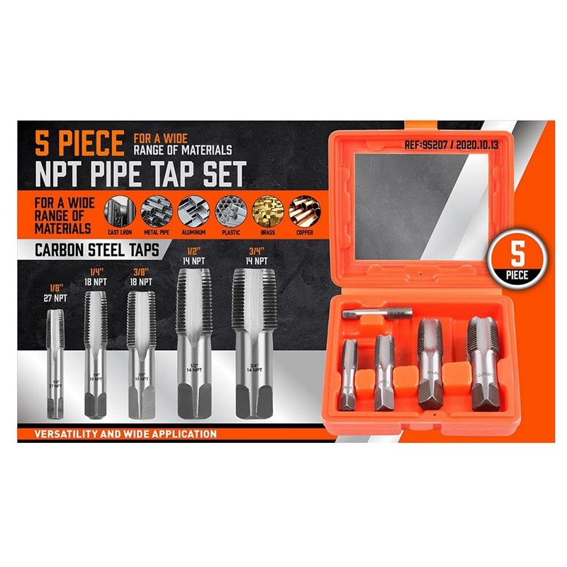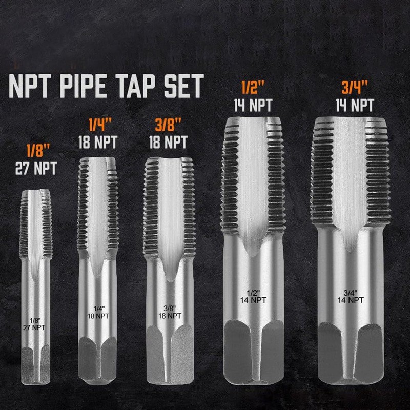 - Versatile set, suitable for personal and professional use. Clean and thread damaged or jammed pipe threads effortlessly - perfect for pipe fittings, DIY enthusiasts, tradesmen and professionals who need to repair damaged pipe threads. Accurately repair damaged pipe threads with our 5 piece NPT pipe tap set.