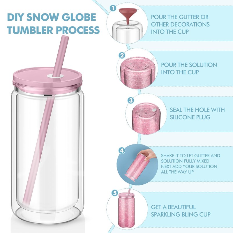 - Enjoy DIY Fun: the 16 oz plastic snow globe tumbler features a pre drilled hole, allowing you to DIY your own snow globe to suit your preferences or to match your personality; Whether you want to fill it with liquid, glitters, sequins, or miniature pieces for an enchanting 3D effect, the choices are endless; Plug is included so you can easily seal the hole when getting the snowglobe tumbler finished