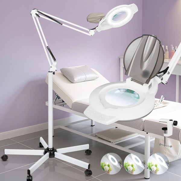 - 2200 Lumen High Brightness: This standing magnifying glass with light uses 144 LEDs to deliver 2200 lumens and a 6000K daylight color temperature, offering glare-free lighting to reduce eye strain. The head-mounted dimmer knob on the esthetician lamp allows for stepless brightness adjustment from 10% to 100%, ensuring customizable lighting for any task. Equipped with a 110V-220V US plug, it ensures stable DC current for consistent lighting, perfect for reading, crafting, or work.