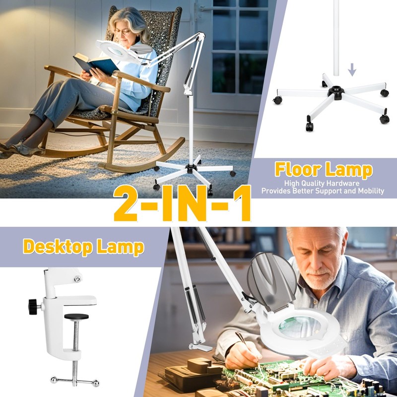 - 2-IN-1 Floor and Table Clamp Lamp: This magnifying glass with stand is designed to be flexible, allowing it to be used as either a stable floor lamp or a table lamp. Its durable metal clamp securely attaches to surfaces up to 2.3 inches thick and features non-slip rubber pads to protect your furniture. When used as a floor magnifying glass with light and stand, reinforced screws at the joint ensure the lamp head remains stable during operation.