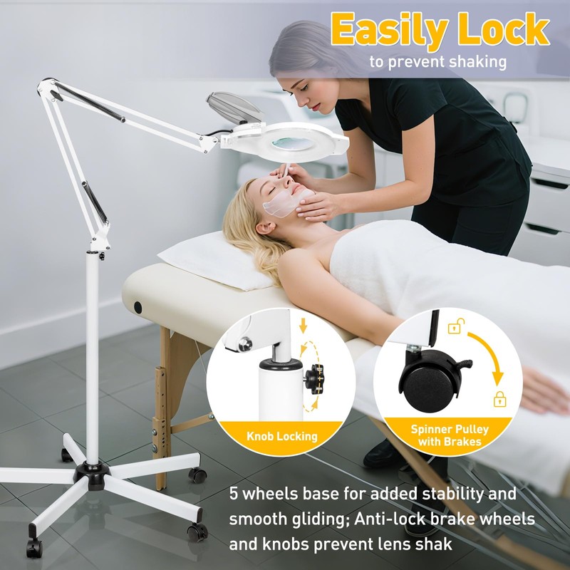 - Upgraded 5-Wheel Rolling Base: The five-wheel base of this magnifying lamp with light is made of durable high-strength material, offering excellent stability and smooth mobility across various surfaces. Unlike heavy disc bases, it’s lightweight yet sturdyEach wheel of this craft lighting floor lamp is equipped with an independent braking system, allowing the lamp to stay securely in place during use.