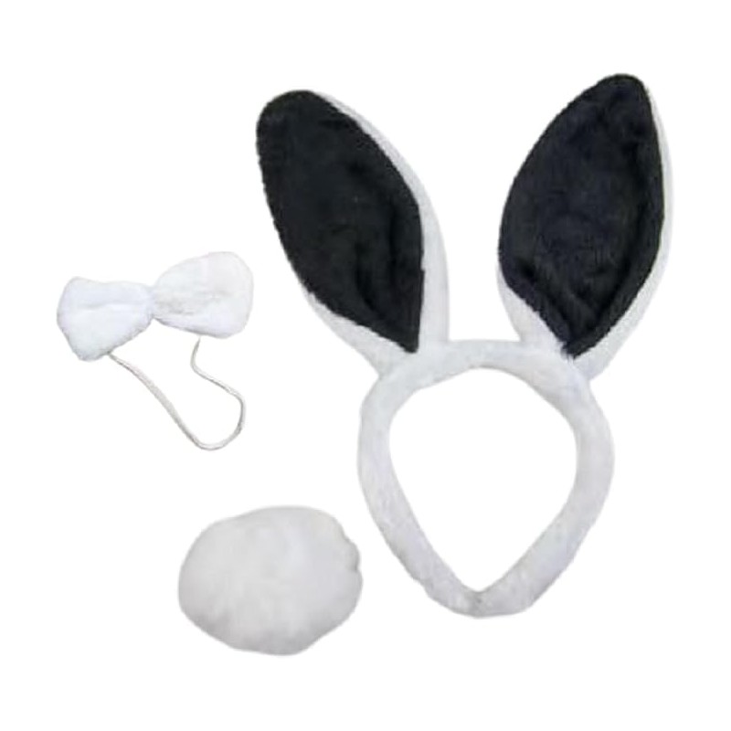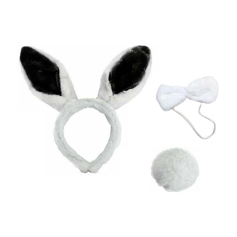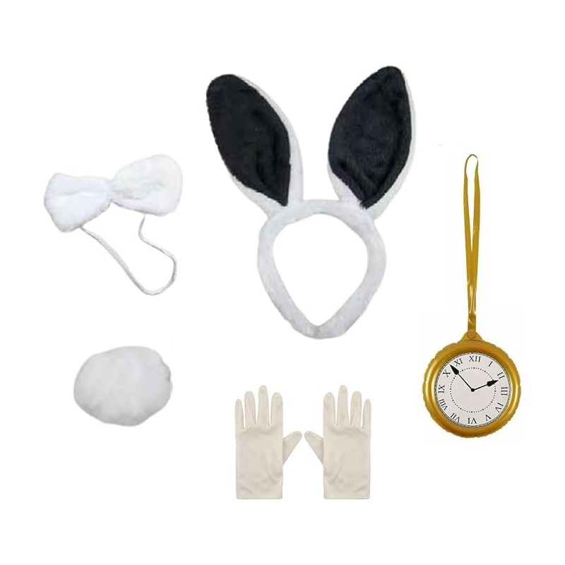 • Set contains 5 items consisting of: 1 x white furry bunny ears headband with black ears, 1 x white furry bunny tail, 1 x white bow tie, 1 x gold inflatable clock & 1 x pair of white gloves.