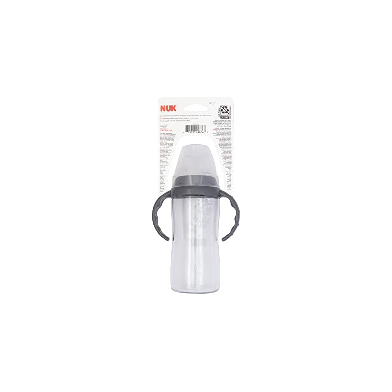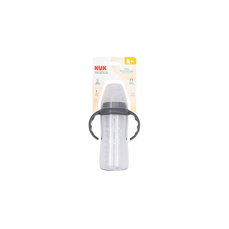 The NUK Large Learner Cup easily promotes baby's transition from breast or bottle to sippy cup. This large learner cup features a spill-proof, soft spout that is gentle on teeth and gums, and it includes an air vent that helps reduce swallowed air. The toddler cup also comes with easy-to-grip, removable handles that your growing child will love. NUK Large Learner Cups are made of crystal-clear Tritan? material, and are BPA-free and dishwasher-safe. Our 10-oz. learner cups are recommended for babies and toddlers 8 months and older.