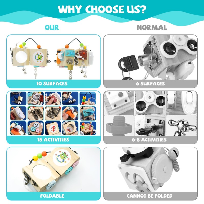 - Improving Hands-on Ability - Educational toys for toddlers on this busy cube that helps kids to develop fine motor skills. Assists babies to practice hand-eye coordination using real world challenges. Or just give them quiet time to focus on the natural learning activities.