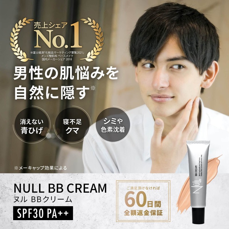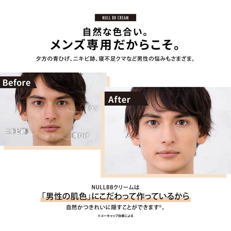 - NULL BB Cream: Neatly hides the undisappearing blue beard. (Hides due to makeup effect) It is also popular as a concealer for spot use. Also recommended for point use. Since it has been adjusted for men, it also reduces the amount of light and sebum fats, and has a finish that won't break easily