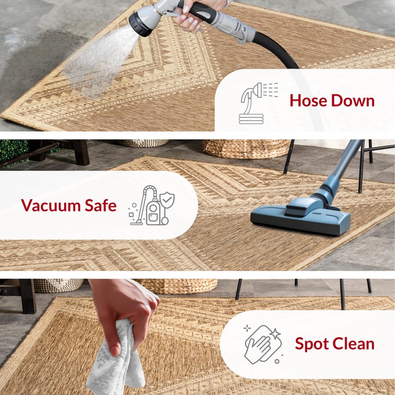 - Outdoor Rug Care Instructions: Easy to care for, simply shake out your outdoor rug to remove any light dirt or debris and spray your area rug with a hose for stubborn stains. This is the perfect patio rug or front porch rug to elevate your home.