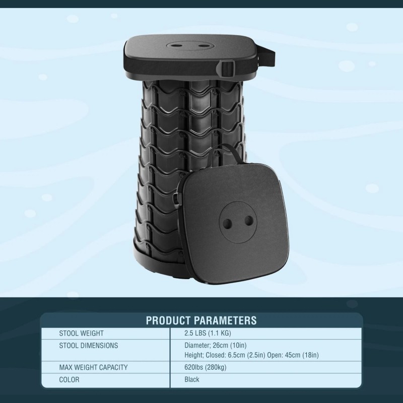 - 【PORTABLE SEAT SIZED FOR EVERYONE】Enjoy a Sturdy, Strong, Lightweight Retractable Folding Stool. Our Portable Travel Seat can support up to 620lbs. Fully collapsed/closed, your Portable Collapsible Stool is only 2.5 x 10 in., but will expand up to 18 in. tall or to your desired adjusted height.