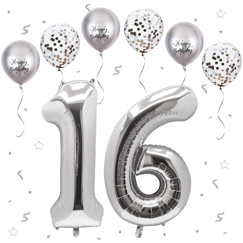 - Silver numbers 16 balloons💕: contains 40 inch Silver numbers 1 and 6 (uninflated), 6 pcs 12 inch confetti balloons with happy birthday, 6 pcs 12 inch metallic balloons, 2 Straw and a ribbon, 16 number foil digital balloons are the best for 16th or 61th birthday party. For your birthday party balloon decoration.