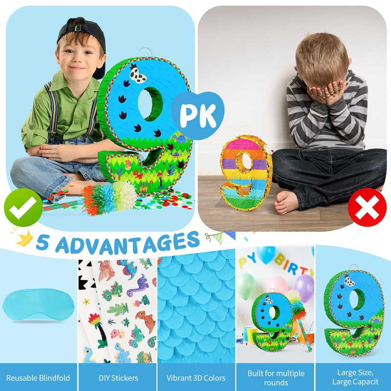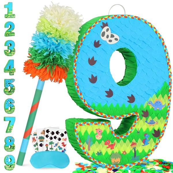 - Happy Birthday Piñata Set: Dinosaur-themed number 9 piñata, perfect for adventurous party decorations. Complete with fabric blindfold, baton, dinosaur-themed confetti and stickers