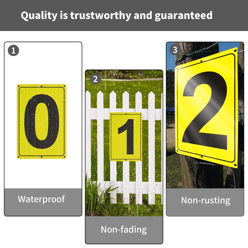 ④Simple Installation:Sized at 8x12 inches with 6 holes for easy installation, our yellow number signs can be affixed either by adhesive attachment or by mounting onto surfaces such as walls or poles, providing a more secure installation compared to others that may only have two holes.