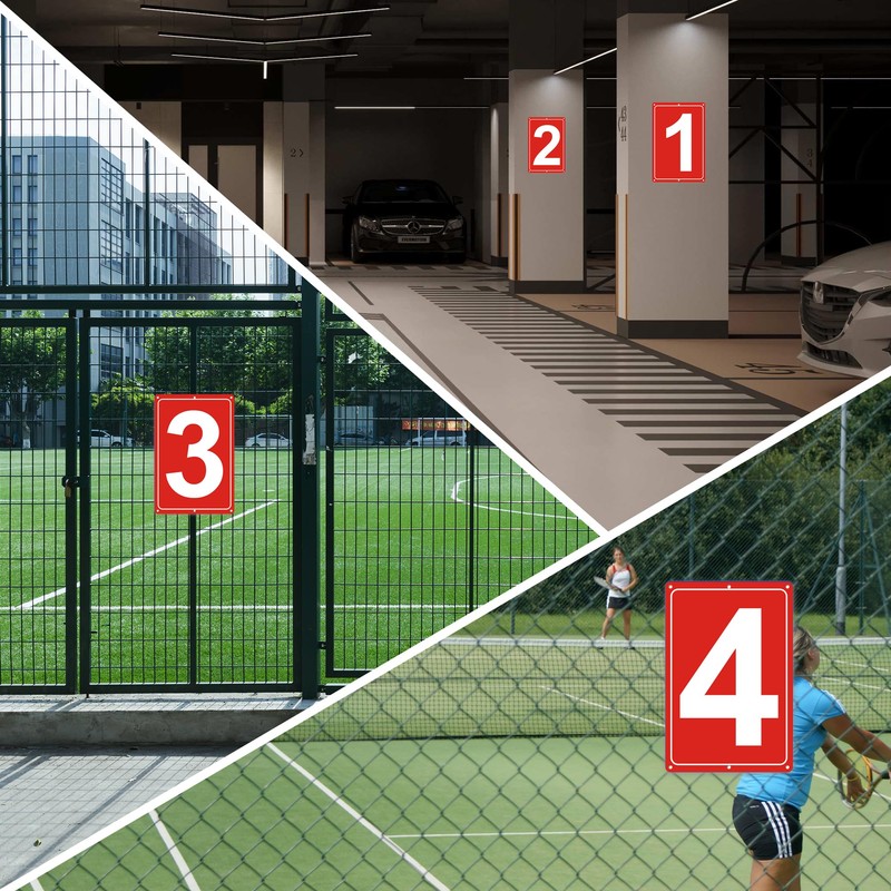 ③Versatile Application:Suitable for both outdoor and indoor use, including parking lots, tennis courts, school playgrounds, and public areas, these versatile number signs serve multiple purposes. From directing traffic to delineating zones and providing essential information, they are indispensable in various settings.