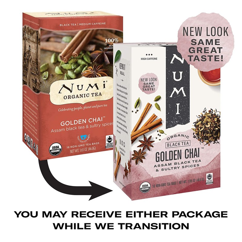 Numi Organic Tea Golden Chai, 18 Count Box of Tea Bags, Black Tea (Packaging May Vary)