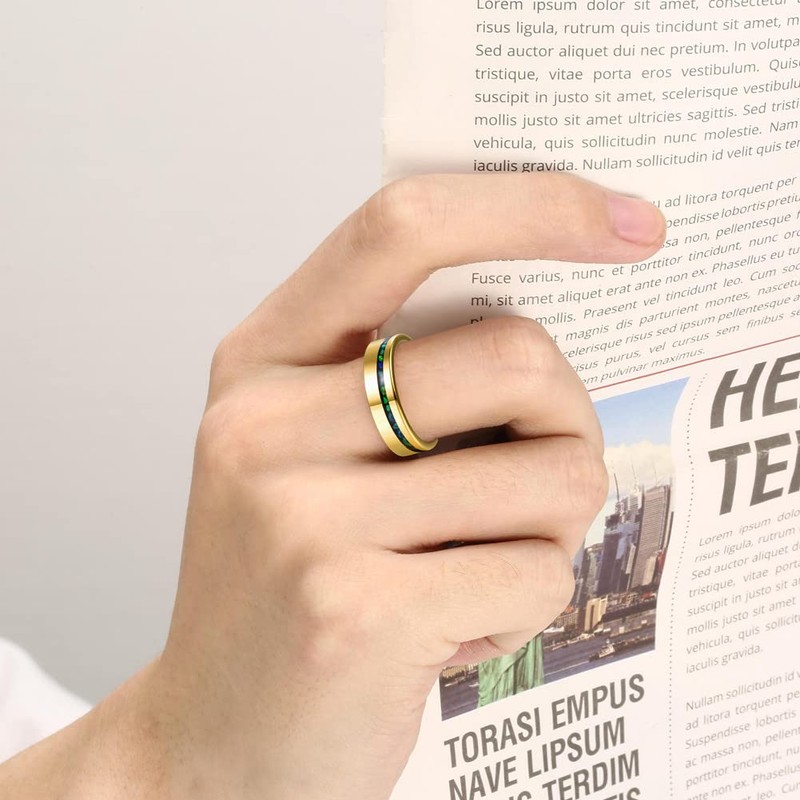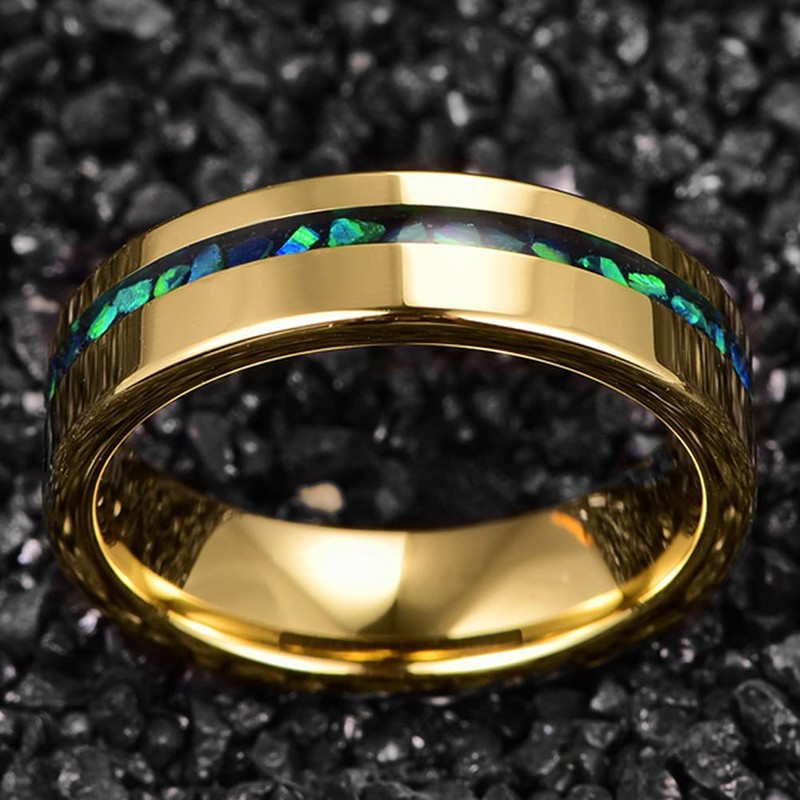 - Design: Gold plated tungsten wedding ring inlaid with green created-opal & polished finish to create an elegant and exquisite jewelry piece
