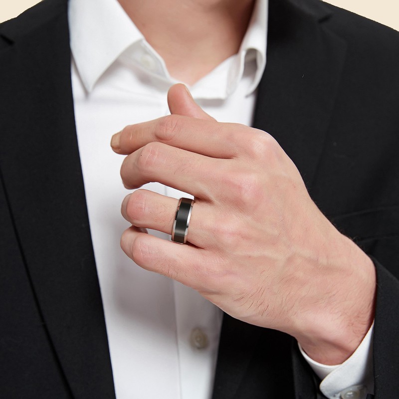 - √ TOP DESIGN This 8mm wide tungsten carbide ring has a matte finish and a highly polished beveled edge that provides a nice contrast.