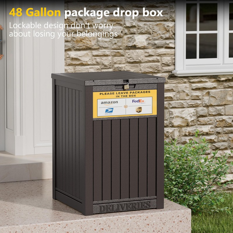 NUNU LAB Package Delivery Box for Outside, 48 Gallon Storage Box with Lockable Secure, Large Double Wall Resin Outdoor Package Delivery with Delivery Sign and Waterproof Deck Box