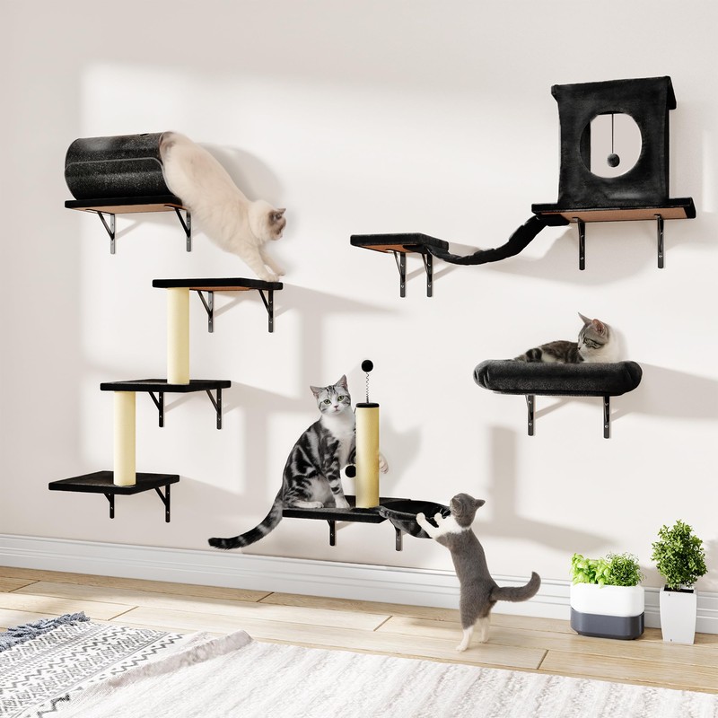 - Deluxe Cat Wall Shelves - This 7pcs cat wall climber set includes a cat tunnel, cat house, cat hammock, cat scratching post and cat steps keep your cat entertained and your walls scratch-free.