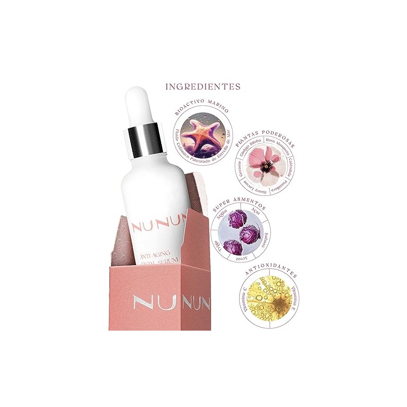 NUNUN Skin. Serum Facial Anti Arrugas, Vitamina C, Extracto Estrella de Mar Antiaging, Vitamina E, Complejo Botanico, Ginkgo Biloba, Argan, Rosa...
