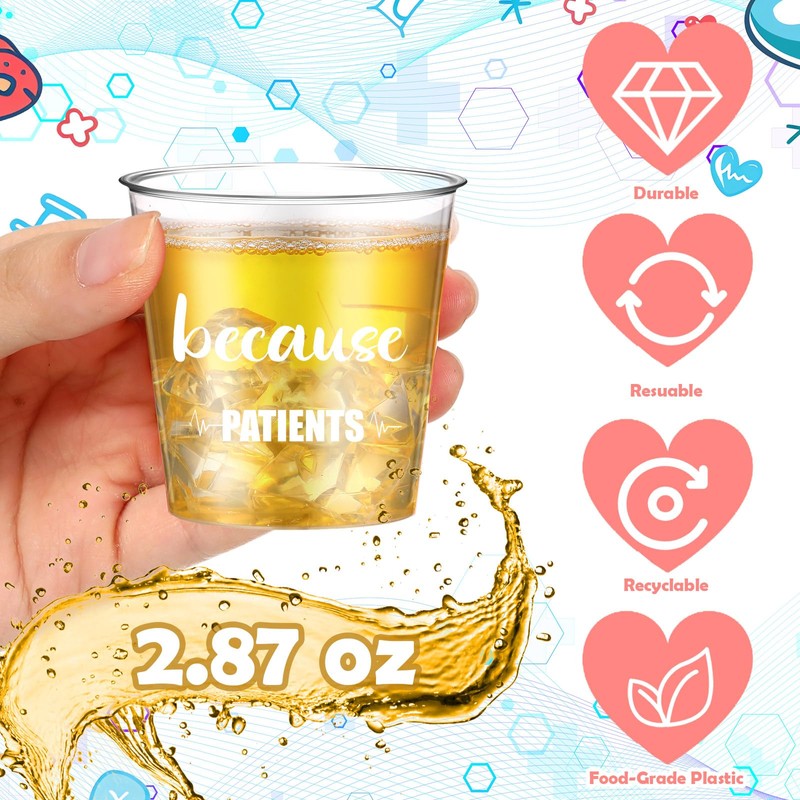 - Sizing and Design: each nurse plastic shot glass can conveniently hold 2.87 ounces of liquid; Nurse related wording design, "Because Patience"; These shot glasses together with keychains engraved with nurse related theme make a reliable addition to a nurse party