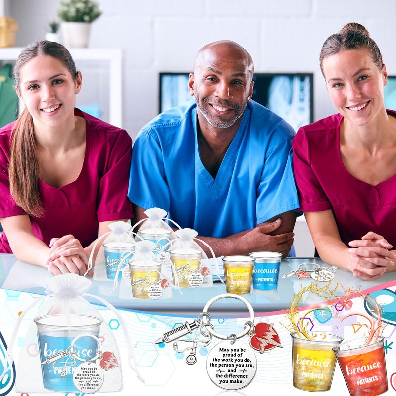 Nuogo 24 Pack Nurses Week Gifts Bulk 2025 Include 2.87oz Disposable Shot Glasses, Keychain and Organza Bag Appreciation Gifts for Graduation Practitioner Student Assistant(Because Patience)