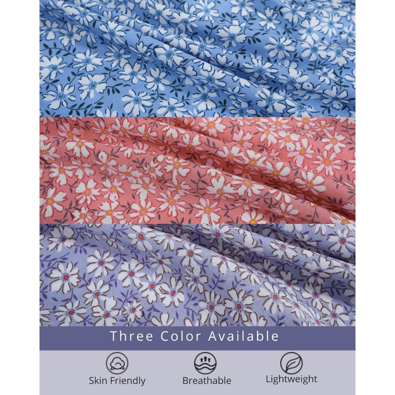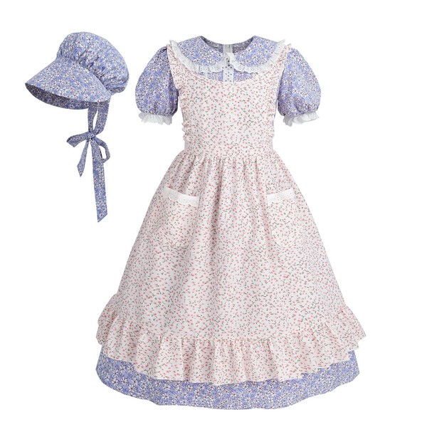 - THREE-PIECE SET: The prairie dresses girls set includes a flower-print dress, apron, and bonnet. The pioneer girls dress is made from 97% polyester, 3% spandex and available in three color blue, pink and purple