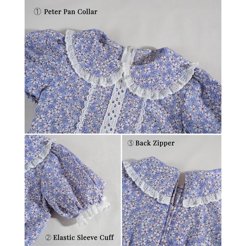 - FEATURES: This girls colonial costume features peter pan collar with ruffle trim, back zipper, lace details on the front, elastic waist and sleeve cuff. The colonial bonnet has elastic at the back and a same calico fabric ties under chin. It’s designed to let your little girl feel like she’s living in the pioneer days.