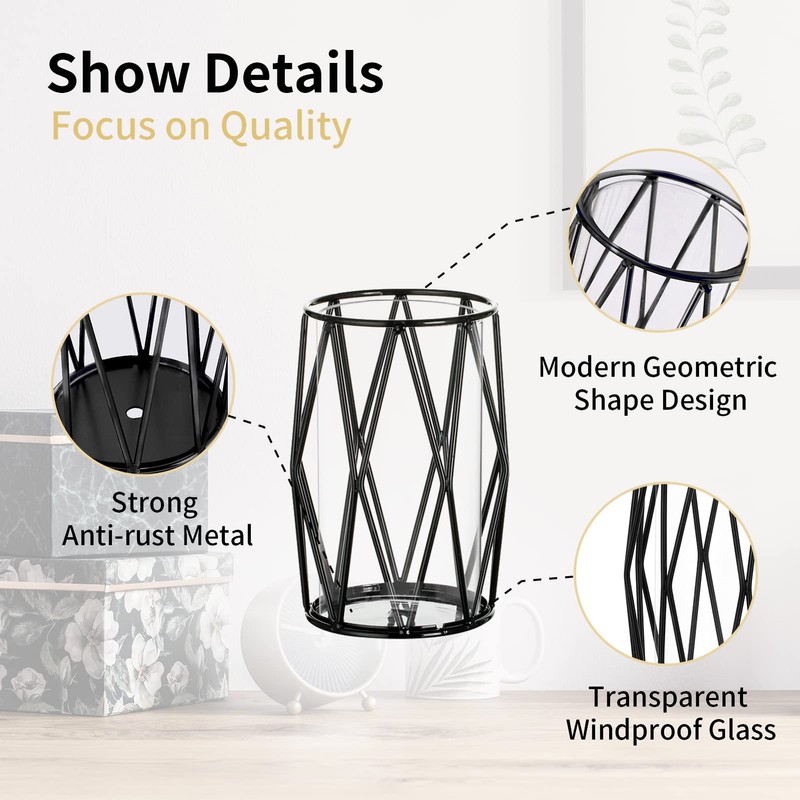 Nuptio Black Pillar Candle Holders - 8 Pcs Glass Candles Holder with Geometric Metal Rack Stand for Wedding Birthday Party Centerpieces - Flower Vase Small Hurricane Vases for Office Living Room