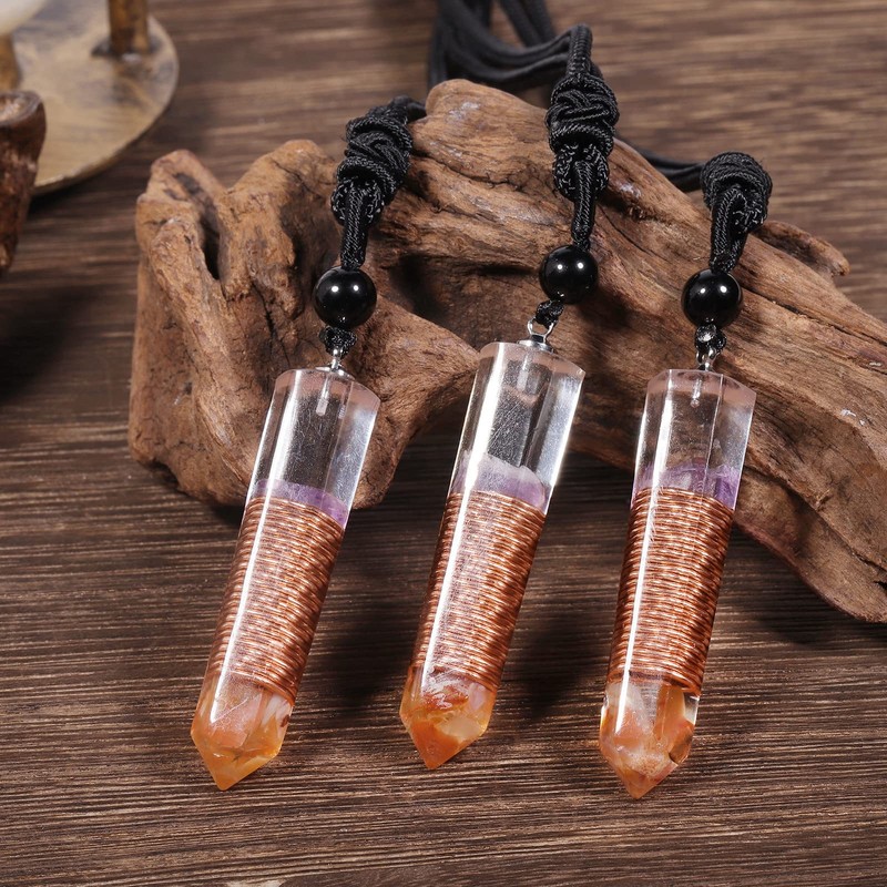 - Materials - irregular raw amethyst stone, chip stones, copper wire, resin, obsidian bead, nylon rope. The pendant may have slightly difference in colour, texture, shape and size. Thus you will receive a similar one to the picture shown. The spiral symbol is used to increase power and focus one's attention. It is an channel for expanding and contacting as the energy flows throughout the body.