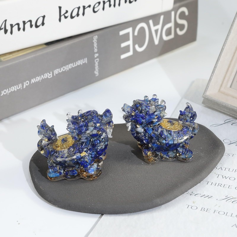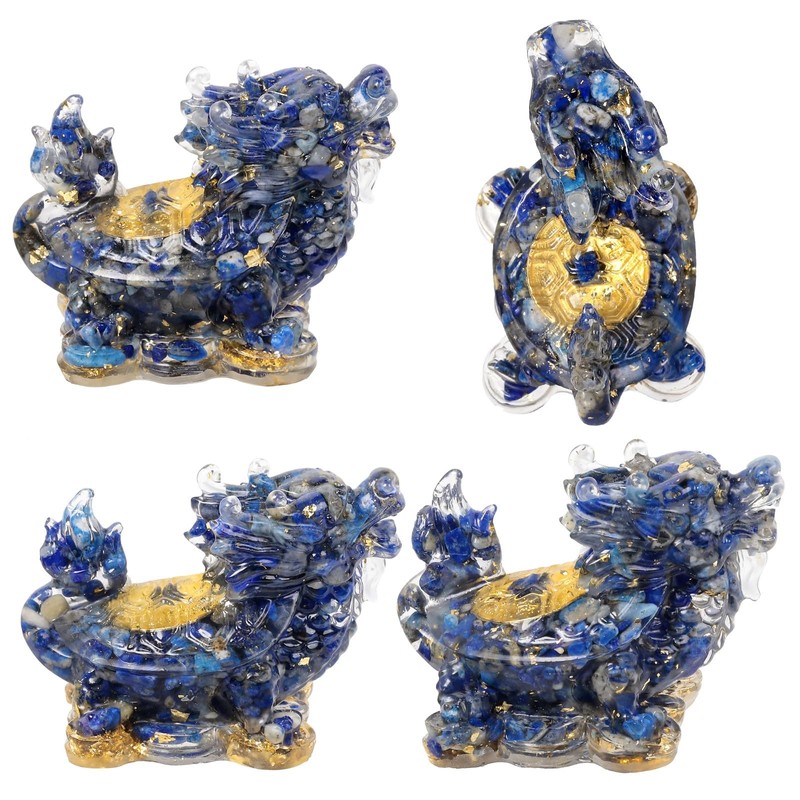 - Details (approx. ):5.7-6.1 cm in height, 3.4-3.6 cm in width, 4.2-4.5 cm in thickness, 45-60 grams/piece weight. The dragon turtle figurine is made of lapis lazuli, resin, gold foil paper and gold coin shaped stickers. Professional carving makes the crystal statue lifelike.