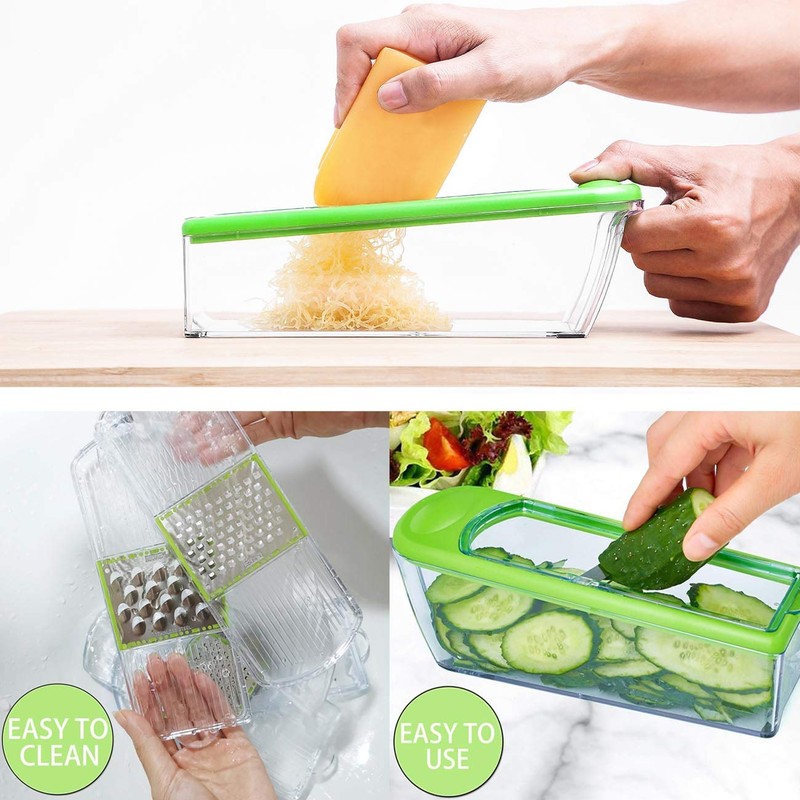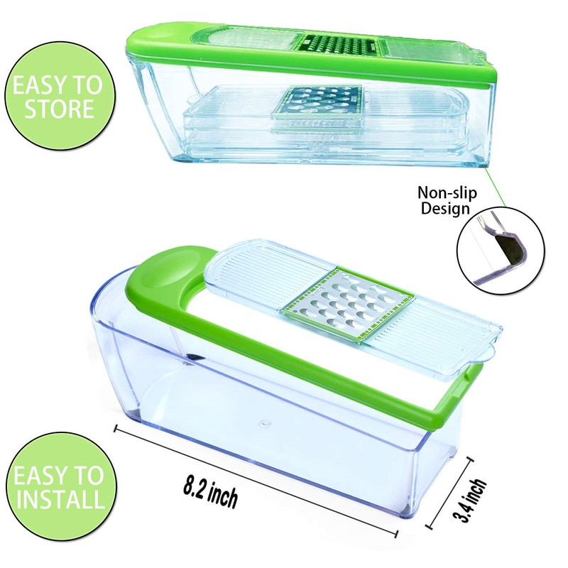 - ✅【EASY TO STORE AND CLEAN】: All parts of the mandolin cutter can be easily removed for easy cleaning. All blades can be stored on the mandolin cutter container to save space and dishwasher safe.