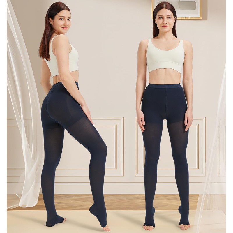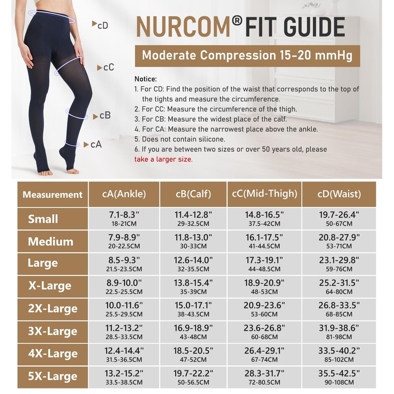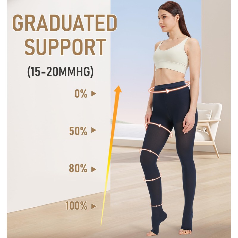 NURCOM open-toe compression tights are designed with graduated compression technology, effectively mitigating leg fatigue. These medical-grade support pantyhose for women are designed to prevent and relieve various conditions, including fatigue, cramps, pain, stiffness, soreness, swelling, shin splints, varicose veins, lymphedema, deep vein thrombosis (DVT), blood clots, plantar fasciitis, and venous insufficiency. Key Features: Compression tights for women and men provide a 15-20mmHg gradient to enhance blood flow and reduce swelling. This product is ideal for individuals with varicose veins, edema, or those who spend long periods standing. This compression pantyhose open-toe design pairs well with various footwear. Perfect for casual and professional use, the opaque fabric ensures a sleek look while offering essential support. The design of compression leggings offers added abdominal support for comfortable wear throughout the day. It enhances posture and prevents slippage, ensuring that open-toe compression stockings stay in place all day. High-rise compression tights for women are made from breathable, high-quality materials, ensuring comfort for extended wear. These pantyhose provide 15-20 mmHg compression and feature durable fabric, guaranteeing long-lasting performance and making them a great investment for your well-being. Functions and Benefits: 1. Compression from support tights improves blood flow, reducing DVT risk during long flights or extended sitting. 2. These compression leggings minimize leg and foot swelling, aiding edema or post-surgery recovery. 3. Whether at work, traveling, or in daily activities, our compression pantyhose provides the support you need for comfort and mobility. In conclusion, our compression pantyhose is a must-have in your wardrobe, combining style, comfort, and functionality, these compression tights cater to diverse lifestyles and health needs. Try therapeutic support hose today and give your legs the support they need!