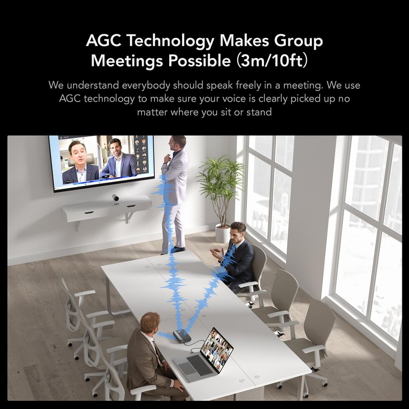 - Full Duplex & Automatic Gain Control: Full duplex audio processing technology allows multiple people to talk at the same time without missing a word. With the help of AGC technology, the volume of the voices within 3m/10ft can be adjusted automatically so the voices of all conference participants can even be understood equally well, even if they sit at different distances and speak at different volumes.