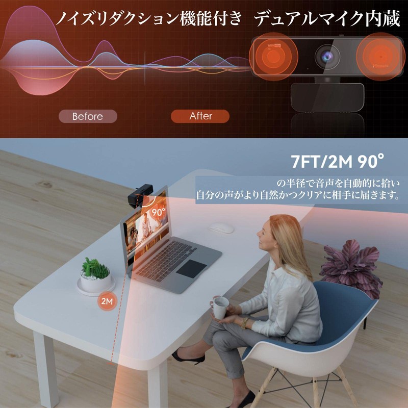 - Dual Microphone with AI Noise Reduction and Noise Reduction Webcam - Includes 2 microphones on each side of the camera. Dual microphone with AI noise reduction can eliminate unwanted noise except 90°, and it automatically picks up the voice at 2 meter/7 feet radius to get your voice more natural and clear. Make communication more comfortable. Capture the sound you need in noisy environments. Perfect for meetings with 4 participants